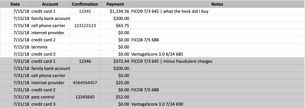 Track Your Payments Create a simple spreadsheet like the one below. This is an example of of what I started with. It all starts with Awareness. Numbers and data have been aren't actuals, but you get the point. (If you actually create a tracker, reply to this email that you did and I'll send you a more in depth one)
